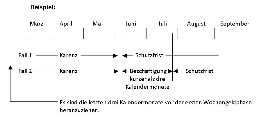 nach einer Beschäftigung im selben Arbeitsverhältnis zwischen einer Karenz und dem neuerlichen Beschäftigungsverbot nach dem MSchG, die zwar länger als drei Kalendermonate dauert, aber in den letzten drei Kalendermonaten gibt es Entgeltunterbrechungen,