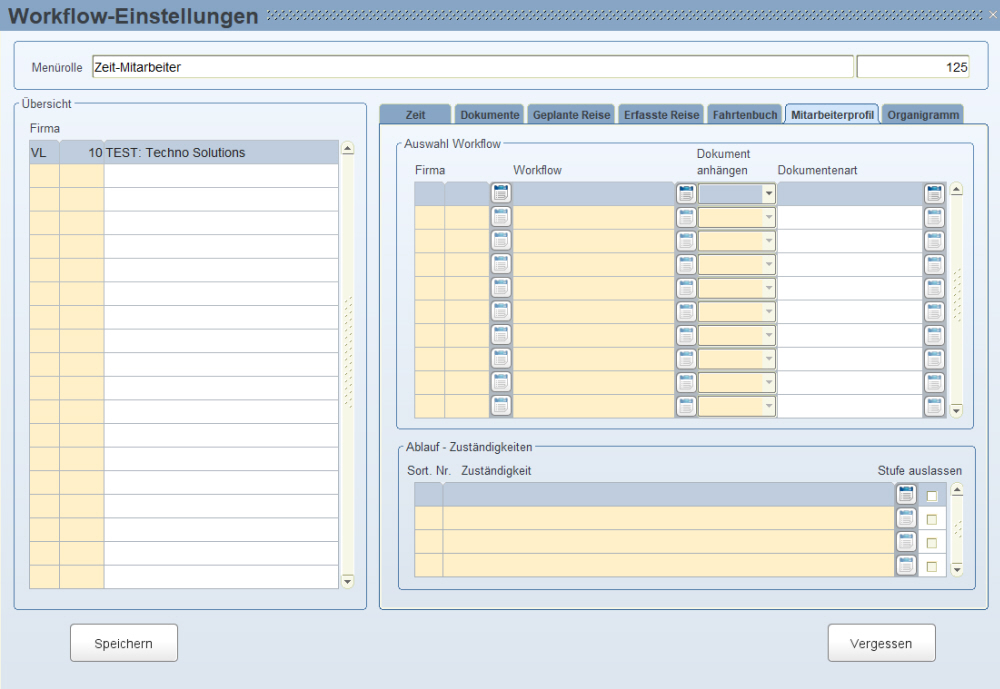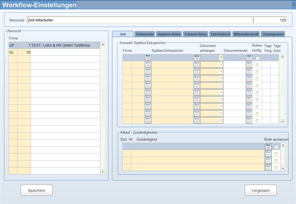 In dieser Maske haben Sie die Möglichkeit festzulegen, welche Zeitspeicher beantragt werden müssen und welchen Genehmigerprozess diese Anträge durchlaufen müssen.