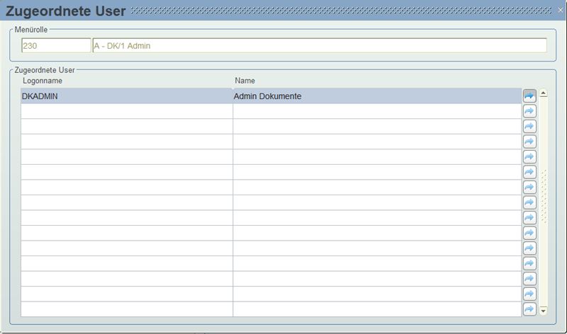 In dieser Maske sehen Sie alle Benutzer, die die ausgewählte Rolle aktuell zugewiesen haben. Über den Pfeil-Button gelangen Sie direkt in die Maske "Berechtigungsverwaltung pro User", wo Sie die Rolle gegebenenfalls entfernen können.