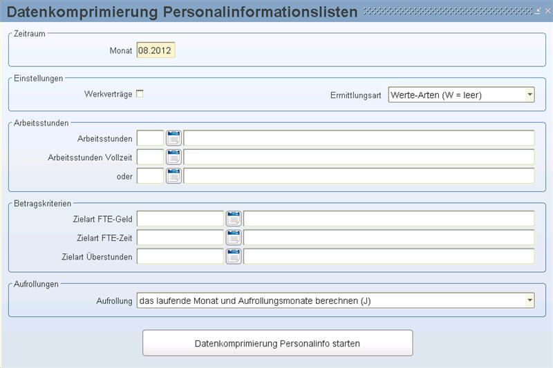 In dieser Maske starten Sie die Datenberechnung für das Personalinformations-Paket. Dieses umfasst Listen für die Personal- und Kostenüberwachung und ist im Menüpunkt Auswertungen/Personalinfo vorhanden. Zusätzlich zum Modul Budget nehmen Sie hier Grundeinstellungen für Aufrufe der Listen vor, welche der Benutzer im Modul Budget nicht sehen und ändern soll. Um die Auswertungen zu beschleunigen, werden Werte aus der Kostenrechnung auf verschiedene Ebenen summiert. Dieses Summieren muss monatlich vor dem Ausdrucken der Auswertungen erfolgen.