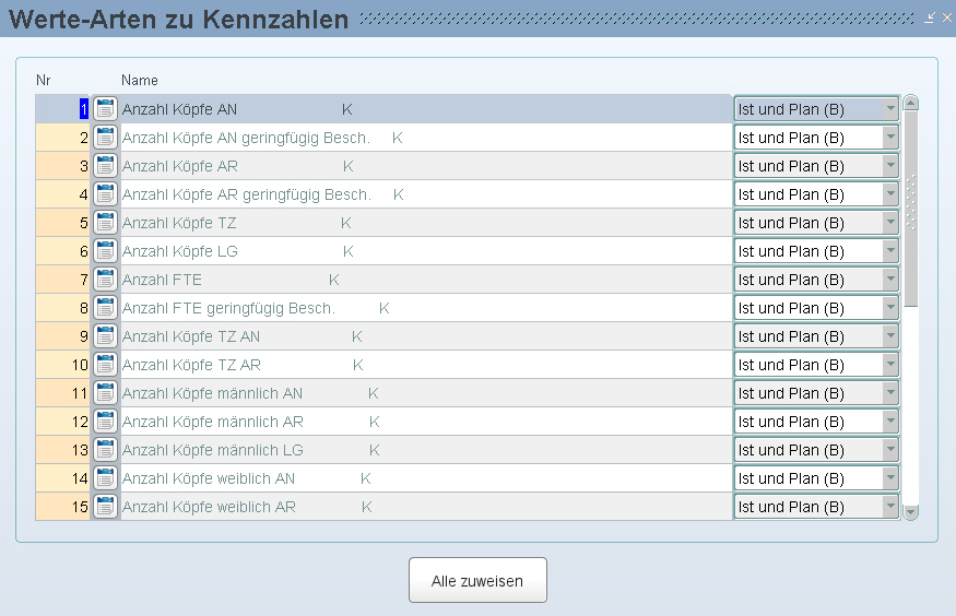 Wenn noch keine Kennzahlen in der Maske sichtbar sind, müssen diese durch Klicken auf den Button „Alle zuweisen“ zugeteilt werden.