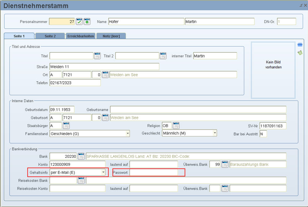 Im Dienstnehmerstamm definieren Sie im Feld „Gehaltsinfo“, dass dieser Mitarbeiter seinen Lohn-/Gehaltszettel per E-Mail bekommen soll.