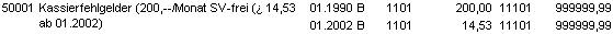 50001 Kassierfehlgeld (bis 14,53,/Monat SV-frei, darüber pflichtig): Beträge bis 14,53- Euro/Monat werden mit der Bezugsart 1101 versteuert (SV-frei, DB-/DZ-/KommSt-pflichtig, LSt nach TARIF). Beträge über 14,53 Euro/Monat werden mit der Bezugsart 11101 versteuert (SV-laufend, DB-/DZ-/KommSt-pflichtig, LSt nach TARIF)