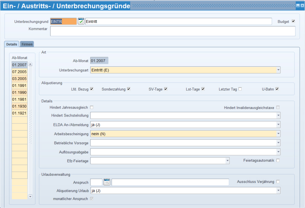 Eintrittsgründe legen Sie in der Maske Stammdatenmenü/Allgemein/Ein-/Austritts-/Unterbrechungsgründe an.