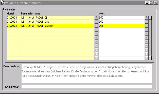 Falls Sie Dienstnehmer haben, die von dem Firmen- oder Dienstnehmergruppenmodell abweichen, legen Sie für diese Dienstnehmer Persönliche Sätze für Dienstjahre und Monatsgehälter an (Stammdaten/Lohnarten/Bezeichnungen und Bewerten/Persönliche Sätze). Diese Persönlichen Sätze weisen Sie in der Maske Variable Firmenparameter zu (Stammdaten/Firma/Parameter).