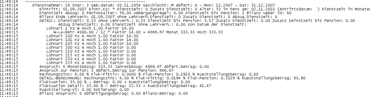 Eingabeprotokoll: Auf der ersten Seite ist ersichtlich, mit welchen Parametern die Rückstellung gestartet wurde. (zB: Rechnungszinssatz, Dienstjahre pro Dienstnehmergruppe usw.)