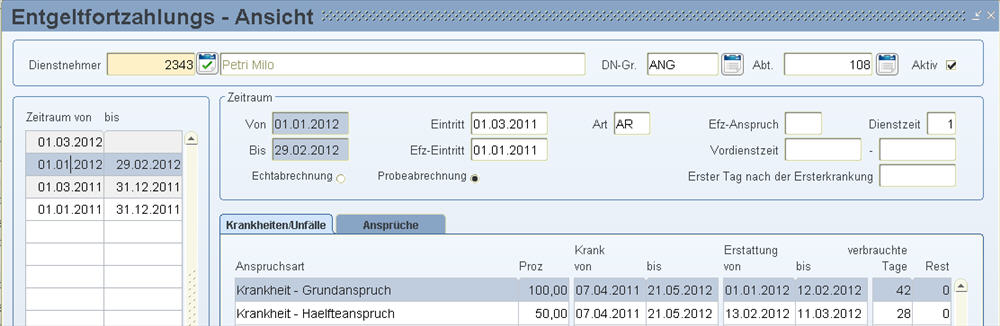 Bei der Eingabe einer Krankheit in der Eintrittsmaske wird nun eine Entgeltfortzahlungsberechnung von der Probeabrechnung gestartet.