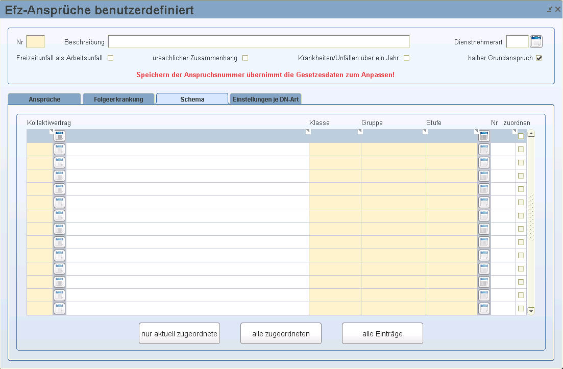 Hier legen Sie benutzerdefinierte EFZ-Ansprüche (= Krankenstandsansprüche) an, falls Ihr Kollektivvertrag von den gesetzlichen Bestimmungen des Angestelltengesetzes, des Entgeltfortzahlungsgeseztes bzw. des Berufsausbildungsgesetztes abweicht.