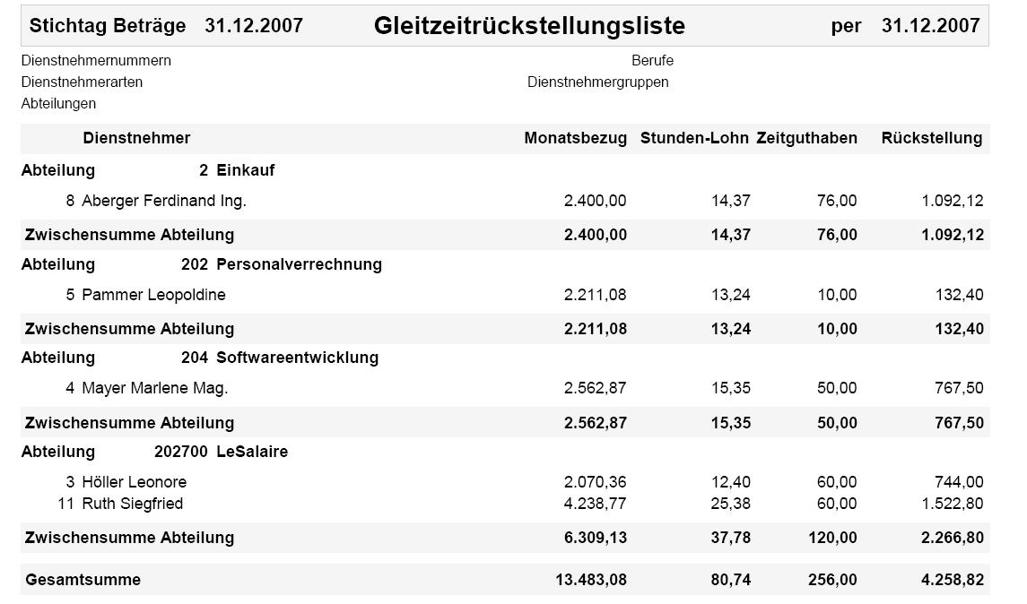 Hat der Dienstnehmer im Laufe eines Geschäfts- bzw. Kalenderjahres einen Saldo an Gleitzeit angesammelt , ist dafür eine Rückstellung zu bilden. In dieser Maske starten Sie die Liste der Gleitzeitrückstellung nach Abteilung.