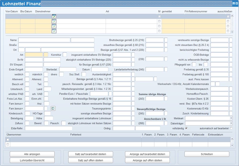 Bedeutet, dass der Lohnzettel Finanz auf keinem Datenträger enthalten ist. Dies kommt vor, wenn der Datensatz händisch auf bearbeitet gesetzt wurde (siehe unten unter Buttons - "Satz auf bearbeitet stellen") oder der Datensatz ist noch offen. |