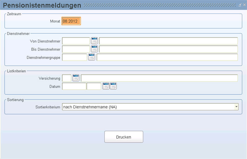 Geben Sie hier das Monat im Format MM.JJJJ ein, für das Sie die Liste drucken möchten. Beim Aufruf der Maske wird Ihnen das aktuelle Monat, welches in der Einstiegsmaske angegeben ist, vorgeschlagen.