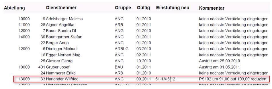 Die Überschrift „Grund einer Nicht-Vorrückung“ wird durch „Kommentar“ ersetzt, wenn die Aufzehrung berücksichtigt werden soll. In dieser Spalte werden zukünftig die Kommentare zur Erhöhung angedruckt.