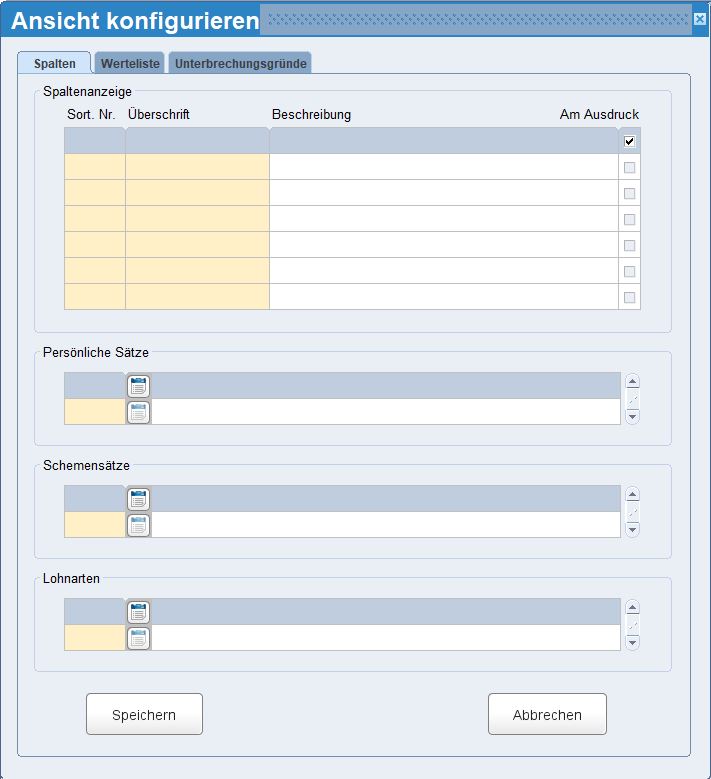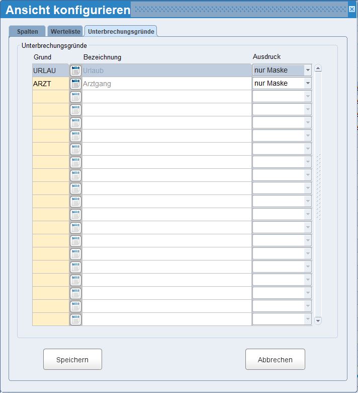 Mit diesem Button rufen Sie die Leinwand zum Setzen der Konfigurationen auf. Dort definieren Sie u.a. die individuellen Spalten, die Wertelisten und die Unterbrechungsgründe.