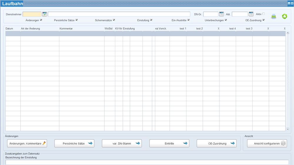 In der Maske Laufbahn (Stammdatenmenü/Personal/Sonstiges) haben Sie die Möglichkeit, eine Historie von Stammdatenänderungen für Mitarbeiter darzustellen. Hier kann zudem über verschiedene Filteroptionen eingestellt werden, welche Arten von Änderungen im Übersichtsblock angezeigt werden sollen.