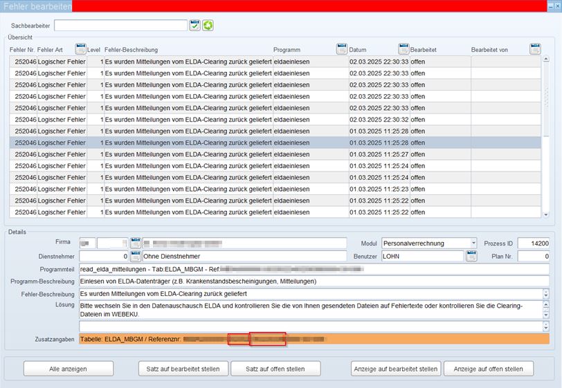 Wenn Sie in der Maske Datenaustausch ELDA einen bereits übermittelten Datenträger mit „Datum für Nacherstellung“ nacherstellen und nochmals übermitteln, bekommt das ganze Paket eine neue Referenznummer, was zu einer Sperrung der mBGM führt. In diesem Fall möchte die ÖGK eine Storno der ersten mBGM, was aber mit der Software nicht mehr möglich ist, weil es die ursprüngliche Referenznummer nicht mehr gibt.