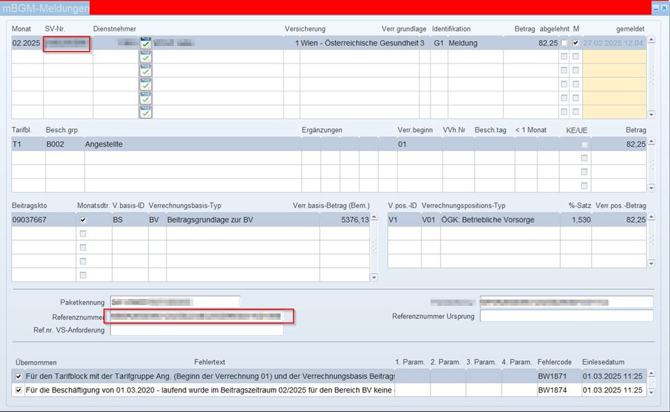 Bei Clearingmeldungen für mBGM sehen Sie die Referenznummer der betroffenen Meldung. Hinter der Referenznummer sehen Sie in der Mitte das betroffene Monat, sowie die SV-Nummer des Dienstnehmers.