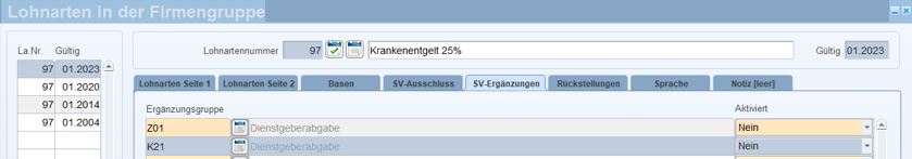 Wenn Sie geringfügig Beschäftigte mit SV-freiem Teilentgelt (zwischen 1% und 49%igen EFZ-Anspruch) abrechnen, setzen Sie bei der betroffenen Lohnart mit dem Betragsteiler „31101 sv-freies Teilentgelt“ den Dienstgeberzuschlag für die Dienstgeberabgabe (ÖGK: Z01, BVAEB: K21) auf „nein“, um einen mBGM Clearingfall zu vermeiden. So wird von der Lohnart kein Dienstgeberzuschlag gerechnet.