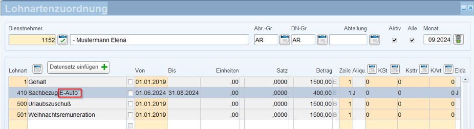 vorhanden, legen Sie eine neue Lohnart für das E-Auto an unter Stammdaten/Lohnarten/Firmengruppen-,