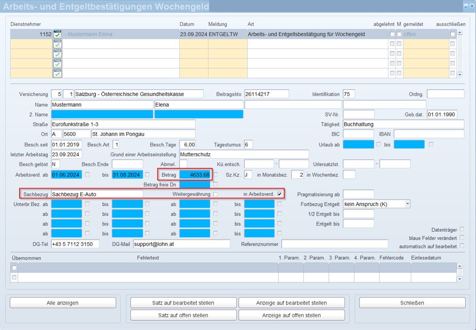 Wenn die Dienstnehmerin aber während des Beschäftigungsverbots das Elektrofahrzeug nicht mehr nutzen darf, ist laut ÖGK für die Arbeits-/Entgeltsbestätigung für Wochengeld wie folgt vorzugehen: