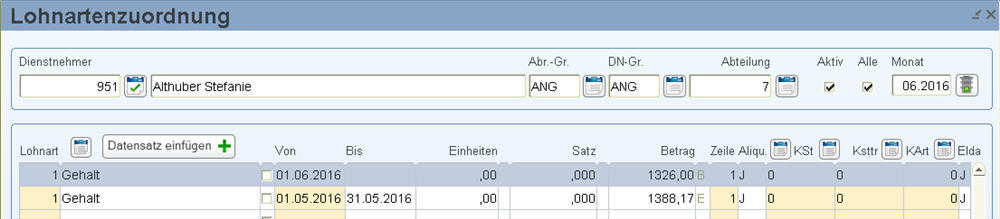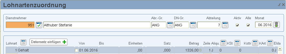 In diesem Beispiel rechnet das Programm im Monat 06.2016 bei der Lohnart 1 Gehalt 1.326,-- Euro bei 30 SV- bzw. 30 LSt-Tagen ab.
