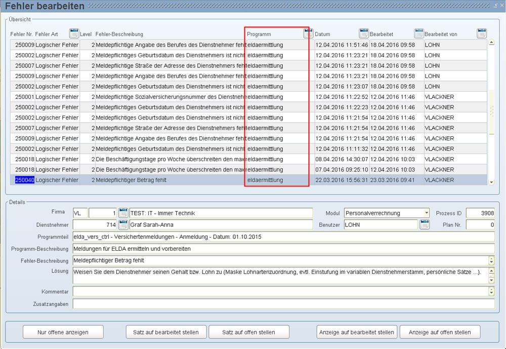 Weiters gibt es hier vom Programm "eldaermittlung" Fehlermeldungen der Dienstnehmer, bei denen Pflichtfelder nicht gefüllt wurden.