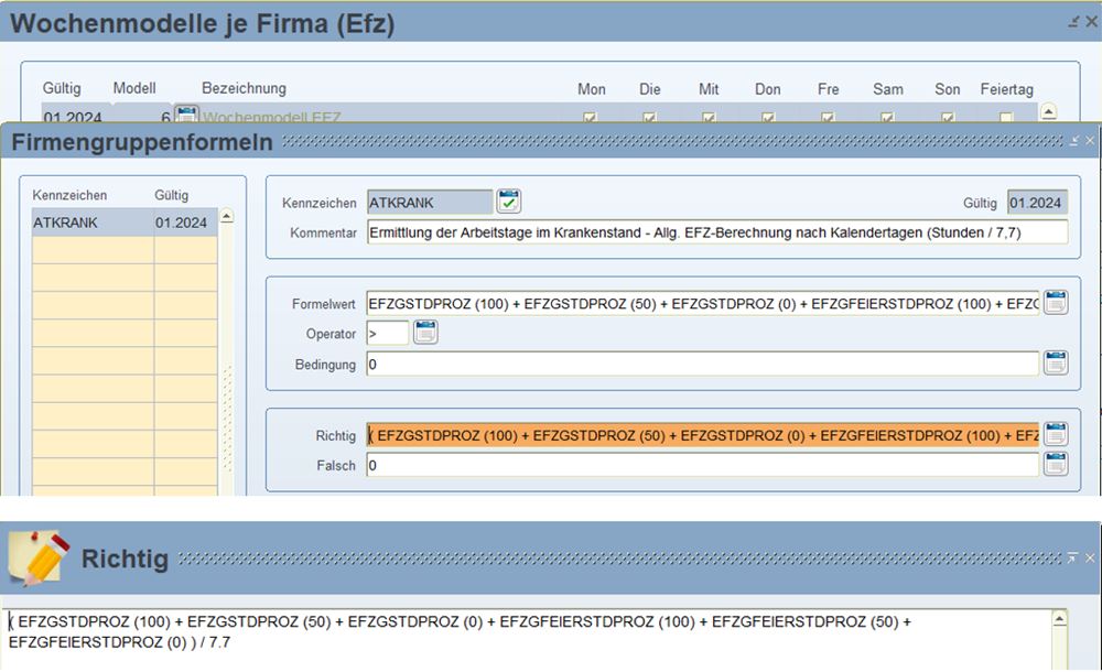 Diese Krankstunden können wir uns nun mit dem Formelkennzeichen „EFZGSTDPROZ“ bzw. für die Feiertage „EFZGFEIERSTDPROZ“ aus dem Wochenmodell ermitteln.