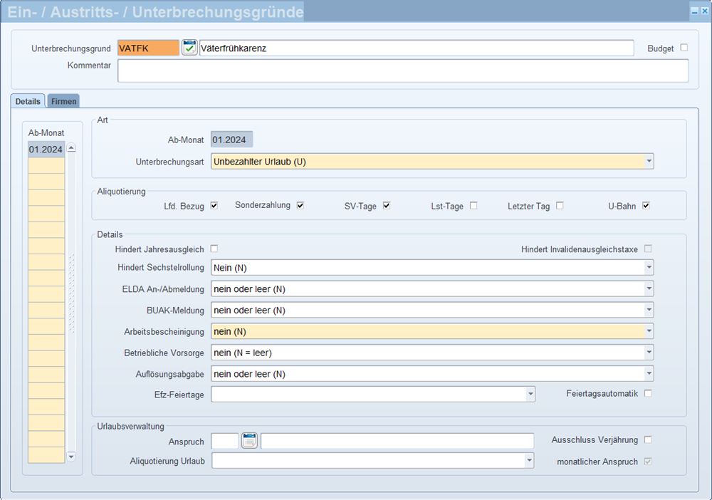Sie den Unterbrechungsgrund Mutterschutz so an, dass im Feld "Betriebliche