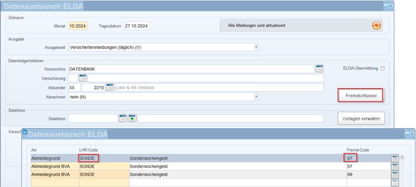 In der Maske Datenaustausch ELDA, Ausgabeart "Versichertenmeldungen" hinterlegen Sie im Button "Fremdschlüssel" die ÖGK/BVAEB Elda Fremdcodes für die Abmeldung wegen Bildungskarenz.