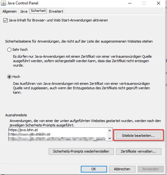 In den Java-Einstellungen unter Start/Systemsteuerung/Java muss die URL zum Server zur Ausnahmeliste hinzugefügt werden.