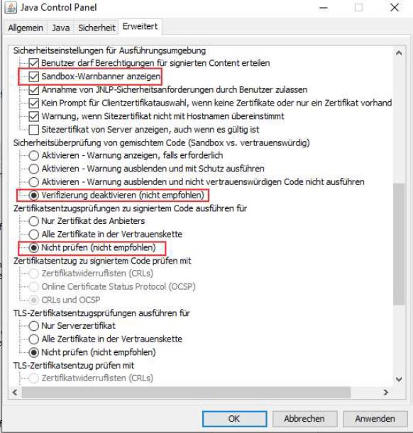 Aktivieren Sie im Reiter „Erweitert“ die Checkboxen für Sicherheitseinstellungen für Ausführungsumgebung, Sicherheitsüberprüfung von gemischtem Code und Zertifikatsentzugsprüfungen zu signiertem Code.