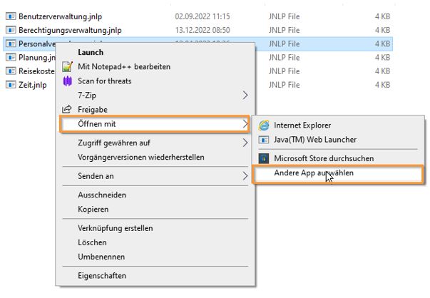 Bei der Auswahl der möglichen Programme "Andere App auswählen" verwenden und unter C:\Programme\java\bin die Datei "javaws.exe" auswählen. Nur mit dieser Datei lassen sich die Java-Programme öffnen.