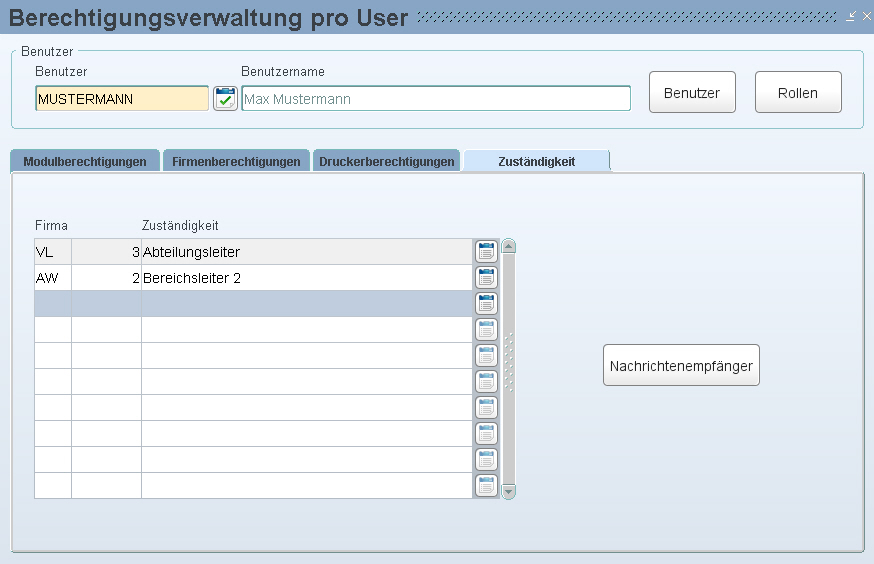 Es ist nur möglich dem User eine Zuständigkeit zuzuweisen, wenn dieser auch als Prüfer für die Zeit unter Nachrichten/Nachrichtenempfänger festgelegt wurde.