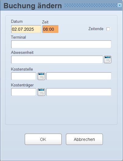 Hier tragen Sie das Tagesdatum der Buchung ein. Standardmäßig wird das Datum der vorher markierten Zeile aus der Zeitdatenliste vorgeschlagen.